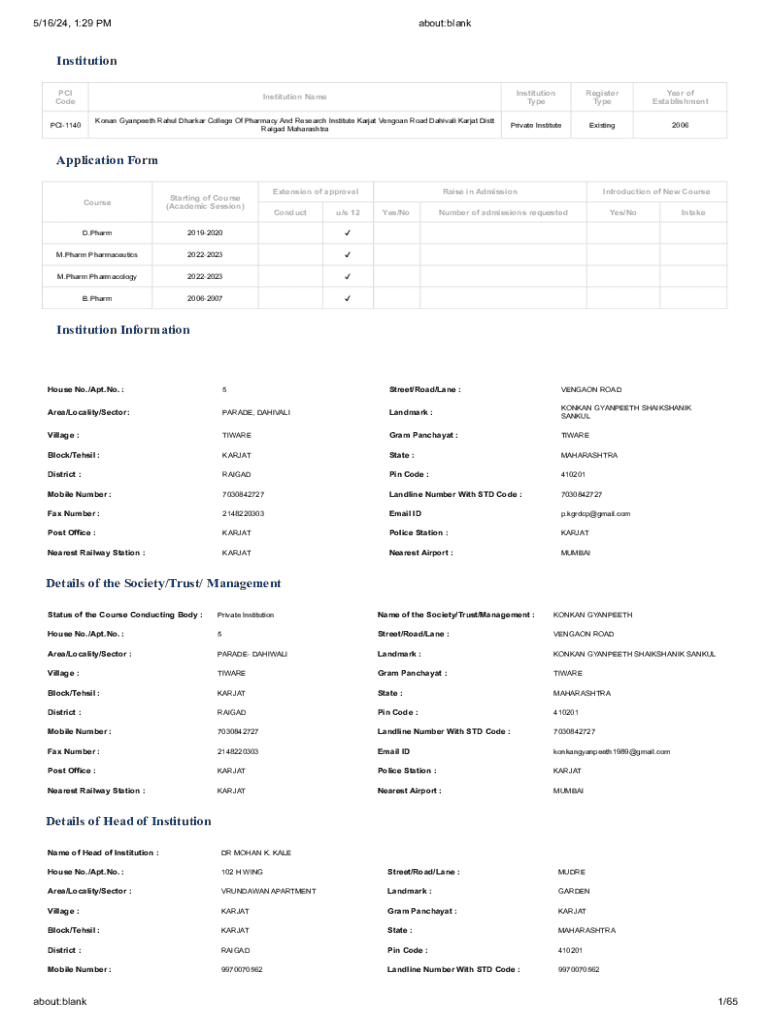 5/16/24, 1:29 PMabout:blankInstitution PCI CodeInstitution NameInstitution TypeRegister TypeYear of EstablishmentPCI1140Konan Gyanpeeth Rahul Dharkar College Of Pharmacy And Research Institute Karjat