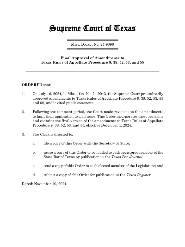 Supreme Court of Texas Misc. Docket No. 249096 Final Approval of Amendments to Texas Rules of Appellate Procedure 9, 38, 52, 53, and 55 ORDERED that: 1.On July 16, 2024, in Misc. Dkt. No. 249043,
