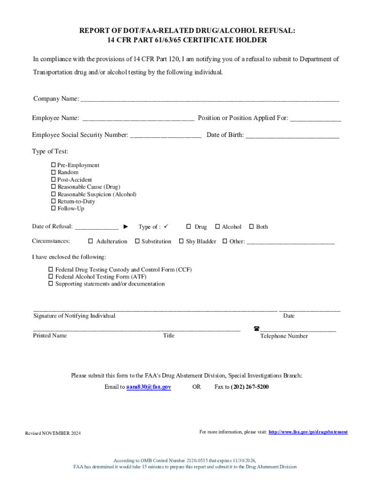 REPORT OF DOT/FAARELATED DRUG/ALCOHOL REFUSAL: 14 CFR PART 61/63/65 CERTIFICATE HOLDER In compliance with the provisions of 14 CFR Part 120, I am notifying you of a refusal to submit to Department