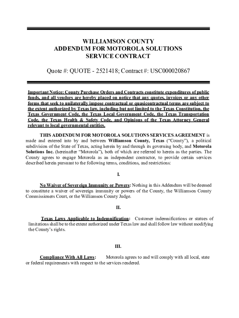 This document is an addendum to the service contract between Williamson County, Texas and Motorola Solutions Inc., outlining the terms, conditions, and services provided by Motorola. It addresses legal and compliance stipulations, payment processes, auditing rights, and dispute resolution mechanisms. The agreement specifies the scope of services, including cybersecurity provisions, and establishes responsibilities regarding the use of public funds.