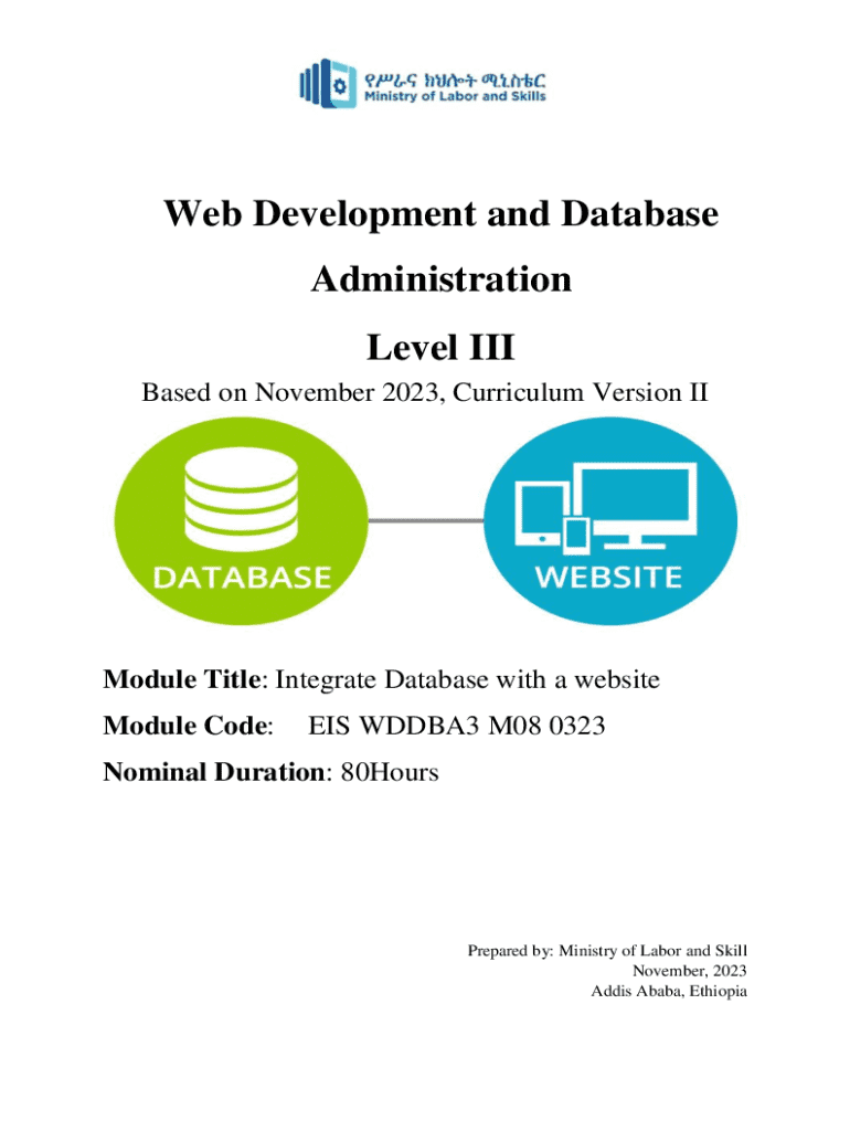 Web Development and Database Administration Level III Based on November 2023, Curriculum Version IIModule Title: Integrate Database with a website Module Code:EIS WDDBA3 M08 0323Nominal Duration: