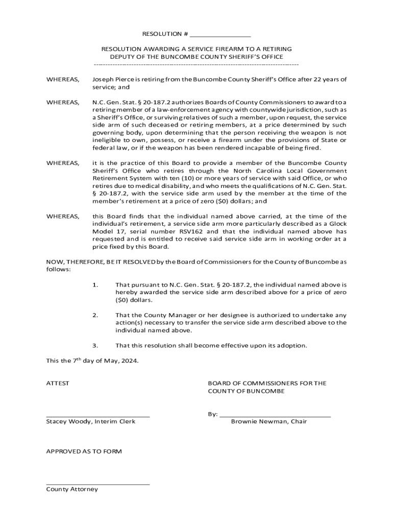 RESOLUTION # ___ RESOLUTION AWARDING A SERVICE FIREARM TO A RETIRING DEPUTY OF THE BUNCOMBE COUNTY SHERIFFS OFFICE WHEREAS,Joseph Pierce is retiring from the Buncombe County Sheriffs Office after