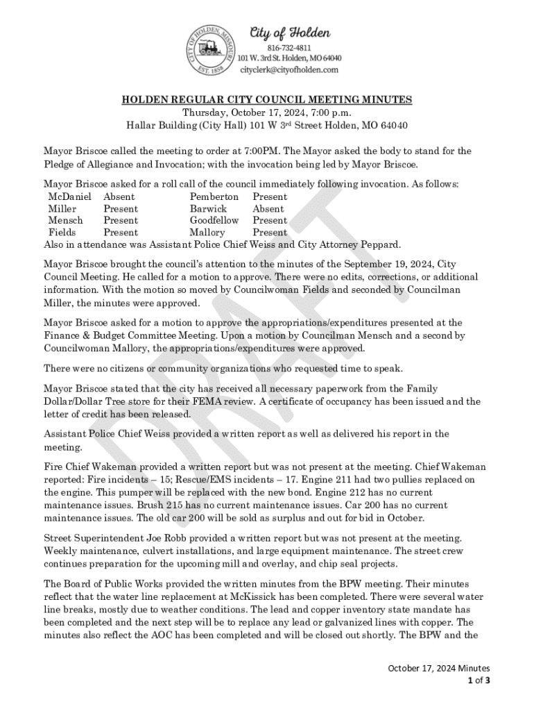 HOLDEN REGULAR CITY COUNCIL MEETING MINUTES Thursday, October 17, 2024, 7:00 p.m. Hallar Building (City Hall) 101 W 3rd Street Holden, MO 64040 Mayor Briscoe called the meeting to order at 7:00PM.