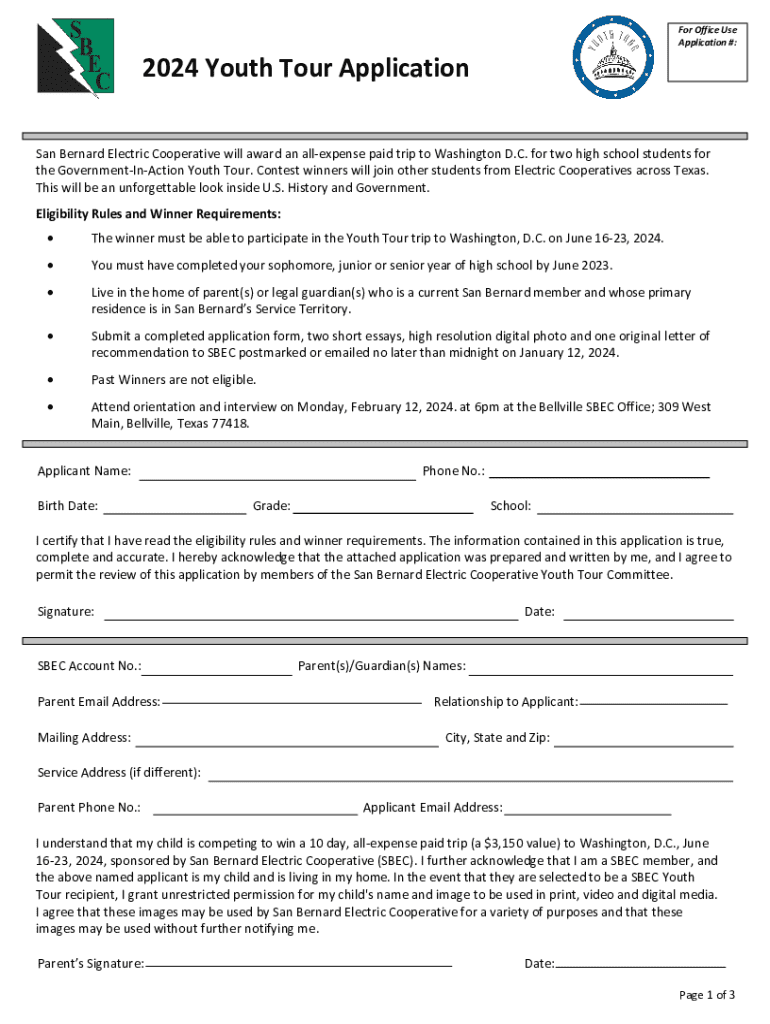 For Office Use Application #:2024 Youth Tour ApplicationSan Bernard Electric Cooperative will award an allexpense paid trip to Washington D.C. for two high school students for the GovernmentInAction