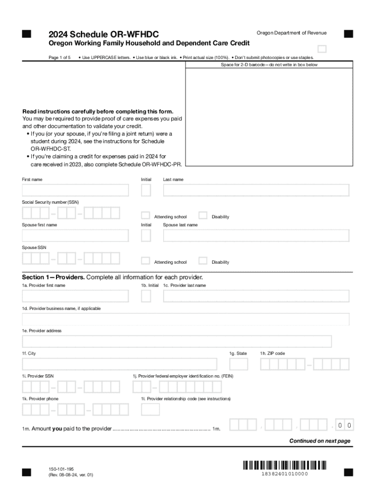 Clear form2024 Schedule ORWFHDCOregon Department of RevenueOregon Working Family Household and Dependent Care Credit Page 1 of 5 Use UPPERCASE letters. Use blue or black ink. Print actual size (100%).