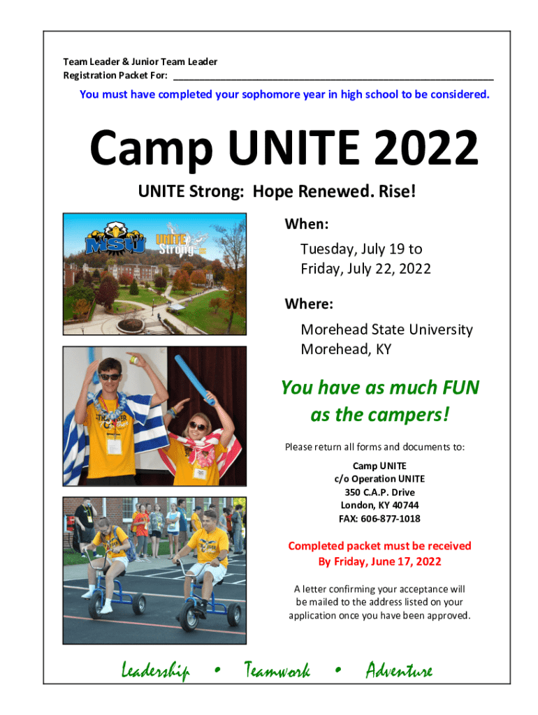 Team Leader & Junior Team Leader Registration Packet For: ___You must have completed your sophomore year in high school to be considered.Camp UNITE 2022 UNITE Strong: Hope Renewed. Rise! When: Tuesday,