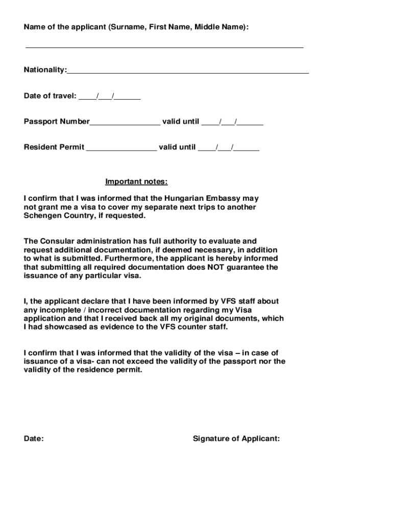 Name of the applicant (Surname, First Name, Middle Name): ___Nationality:___Date of travel: ___/___/___Passport Number___ valid until ___/___/___Resident Permit ___ valid until ___/___/___Important