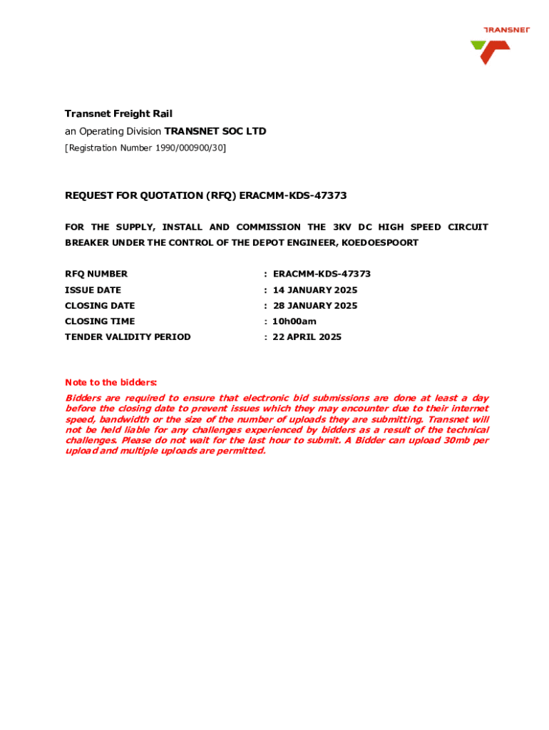 Transnet Freight Rail an Operating Division TRANSNET SOC LTD [Registration Number 1990/000900/30]REQUEST FOR QUOTATION (RFQ) ERACMMKDS47373 FOR THE SUPPLY, INSTALL AND COMMISSION THE 3KV DC HIGH SPEED