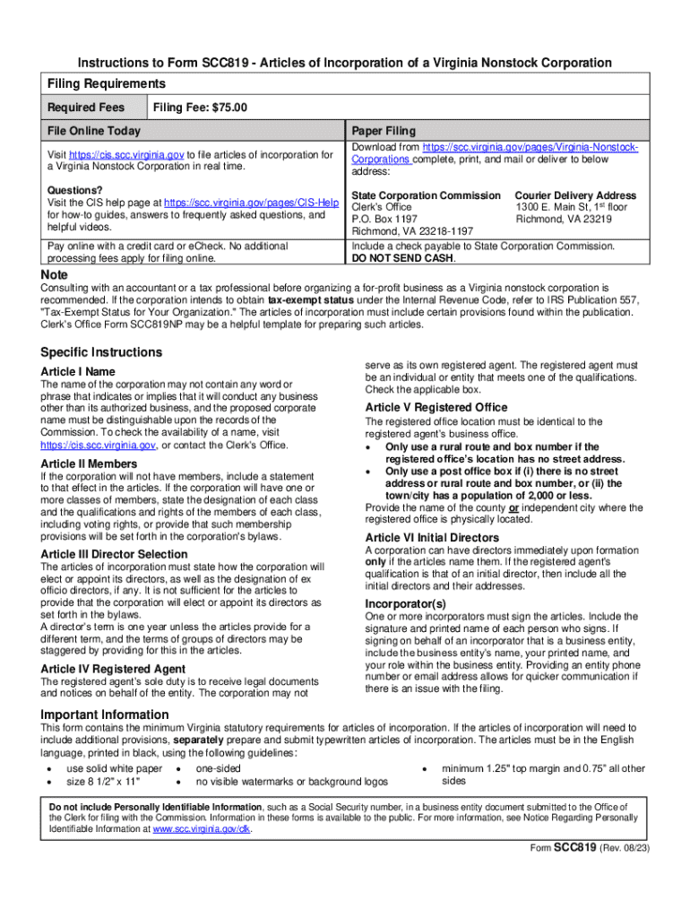 This document provides instructions and requirements for filing the Articles of Incorporation for a Virginia Nonstock Corporation, including necessary fees, filing methods, specific provisions that must be included, and guidelines to follow.