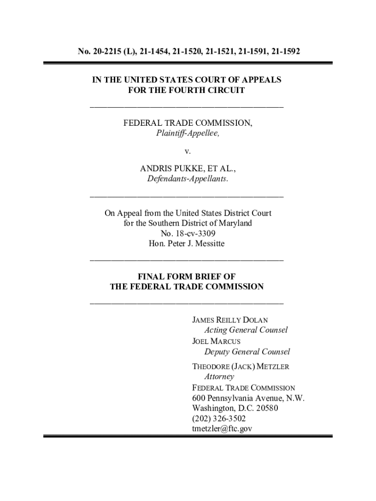 No. 202215 (L), 211454, 211520, 211521, 211591, 211592 IN THE UNITED STATES COURT OF APPEALS FOR THE FOURTH CIRCUIT FEDERAL TRADE COMMISSION, PlaintiffAppellee, v. ANDRIS PUKKE, ET AL., DefendantsAppellants.