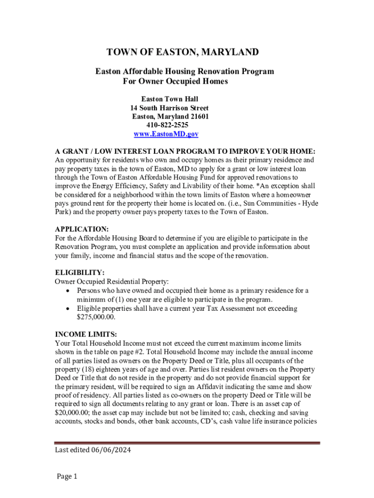 TOWN OF EASTON, MARYLAND Easton Affordable Housing Renovation Program For Owner Occupied Homes Easton Town Hall 14 South Harrison Street Easton, Maryland 21601 4108222525 www.EastonMD.gov A GRANT