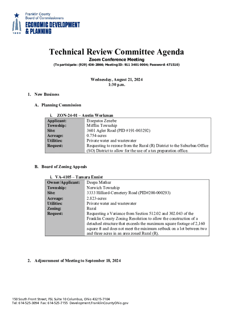 This document outlines the agenda for the Technical Review Committee meeting scheduled to discuss new business items including rezoning requests and variances for properties in Franklin County.