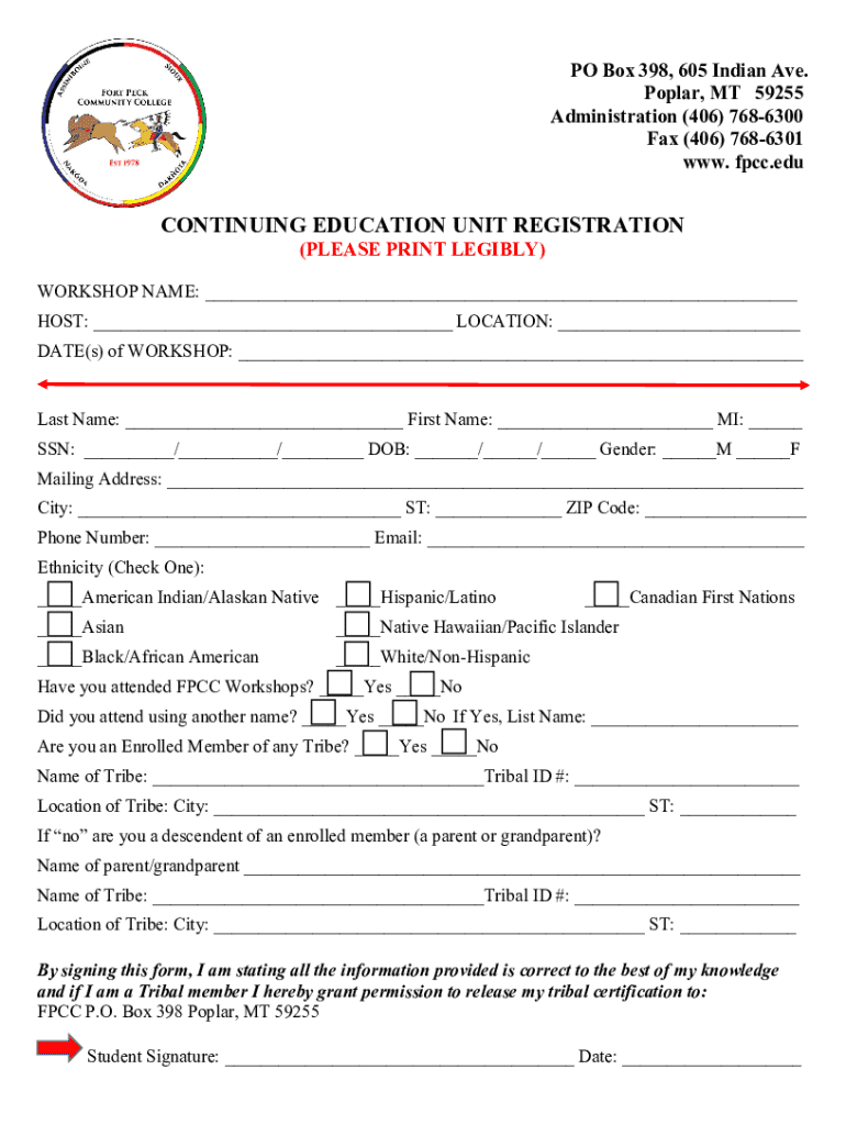 PO Box 398, 605 Indian Ave. Poplar, MT 59255 Administration (406) 7686300 Fax (406) 7686301 www. fpcc.eduCONTINUING EDUCATION UNIT REGISTRATION (PLEASE PRINT LEGIBLY) WORKSHOP NAME: ___ HOST: ___