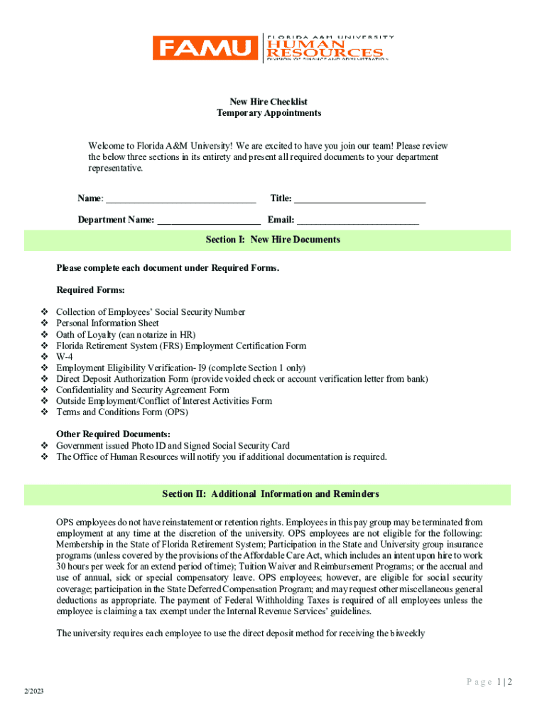 This document serves as a comprehensive checklist for new hires at Florida A&M University, outlining the required documents, mandatory training, and responsibilities related to employment. It details forms to be completed, employee rights and obligations, and the importance of confidentiality concerning university information.