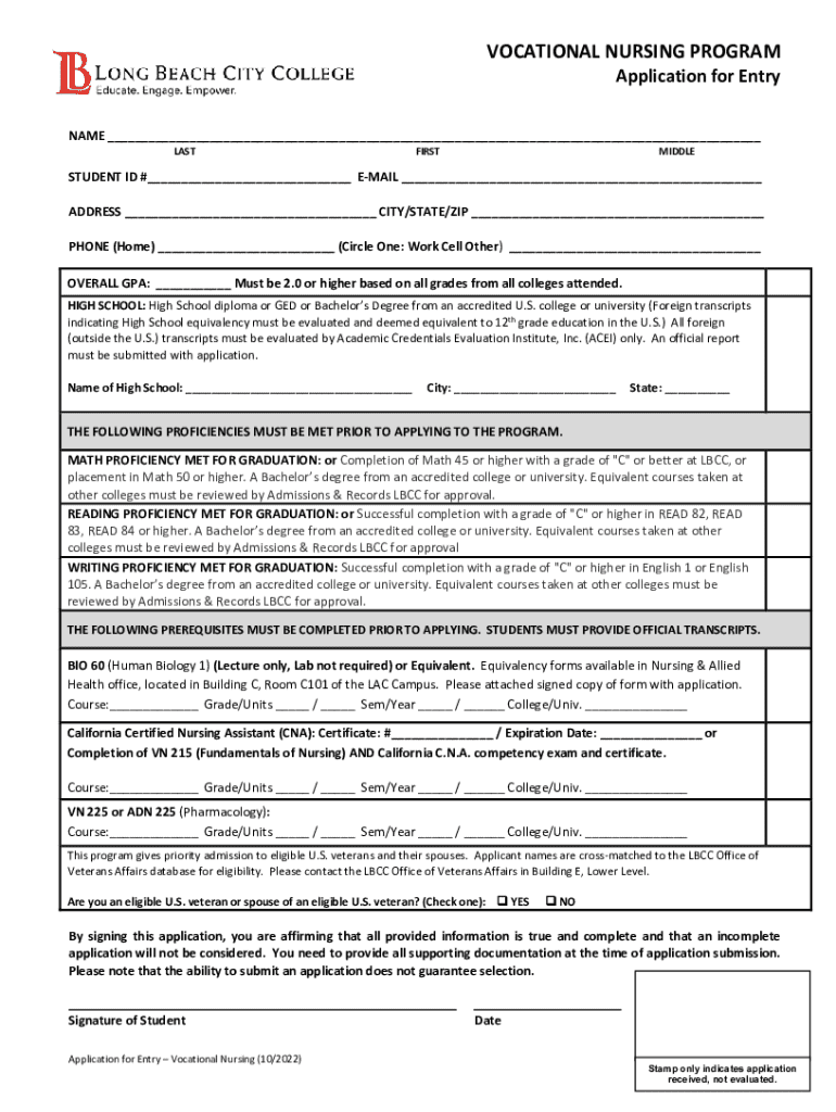 VOCATIONAL NURSING PROGRAMApplication for EntryNAME ___ LASTFIRSTMIDDLESTUDENT ID #___ EMAIL ___ ADDRESS ___ CITY/STATE/ZIP ___ PHONE (Home) ___ (Circle One: Work Cell Other) ___ OVERALL GPA: ___