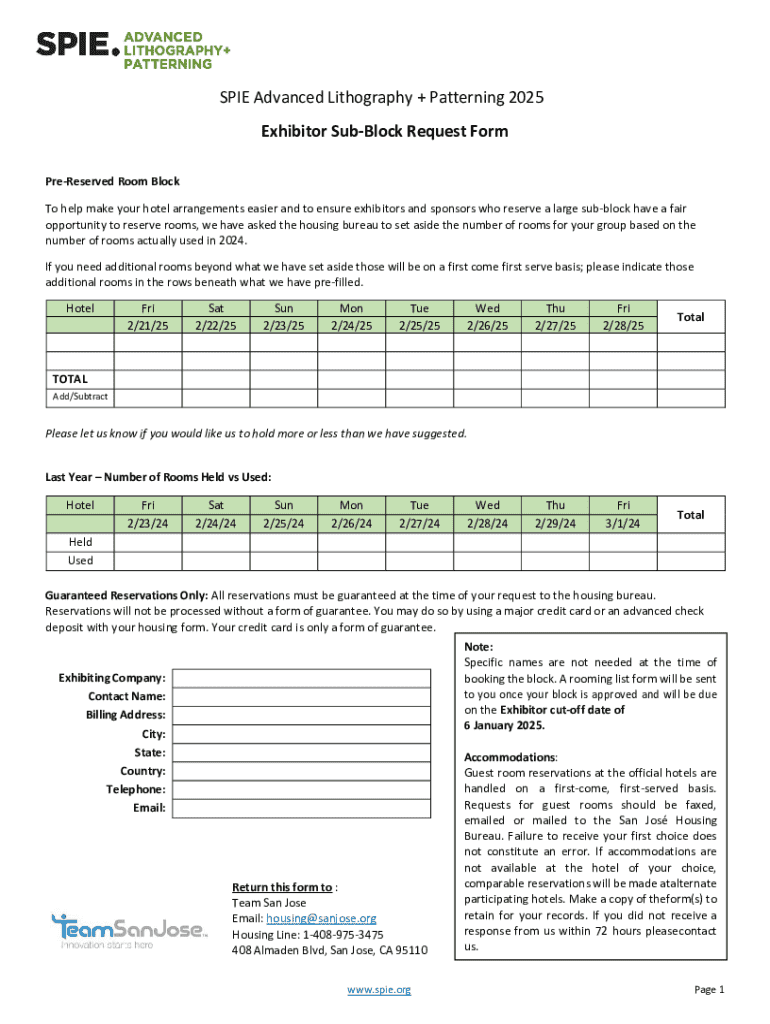 SPIE Advanced Lithography + Patterning 2025 Exhibitor SubBlock Request Form PreReserved Room Block To help make your hotel arrangements easier and to ensure exhibitors and sponsors who reserve a large