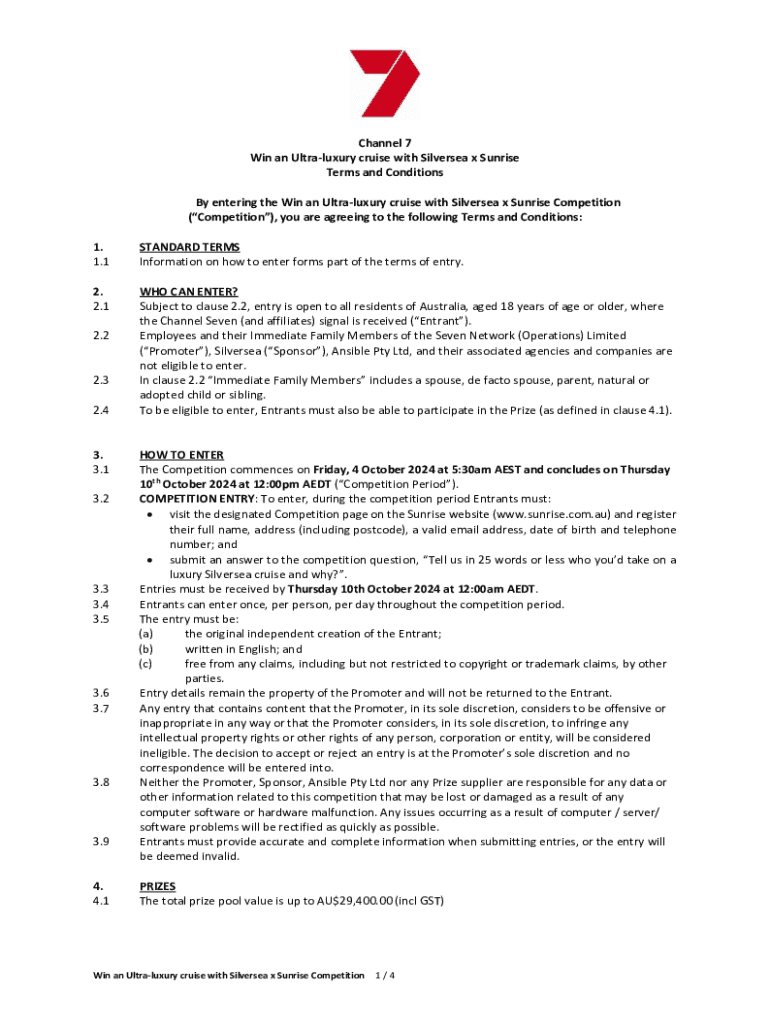 Channel 7 Win an Ultraluxury cruise with Silversea x Sunrise Terms and Conditions By entering the Win an Ultraluxury cruise with Silversea x Sunrise Competition (Competition), you are agreeing to