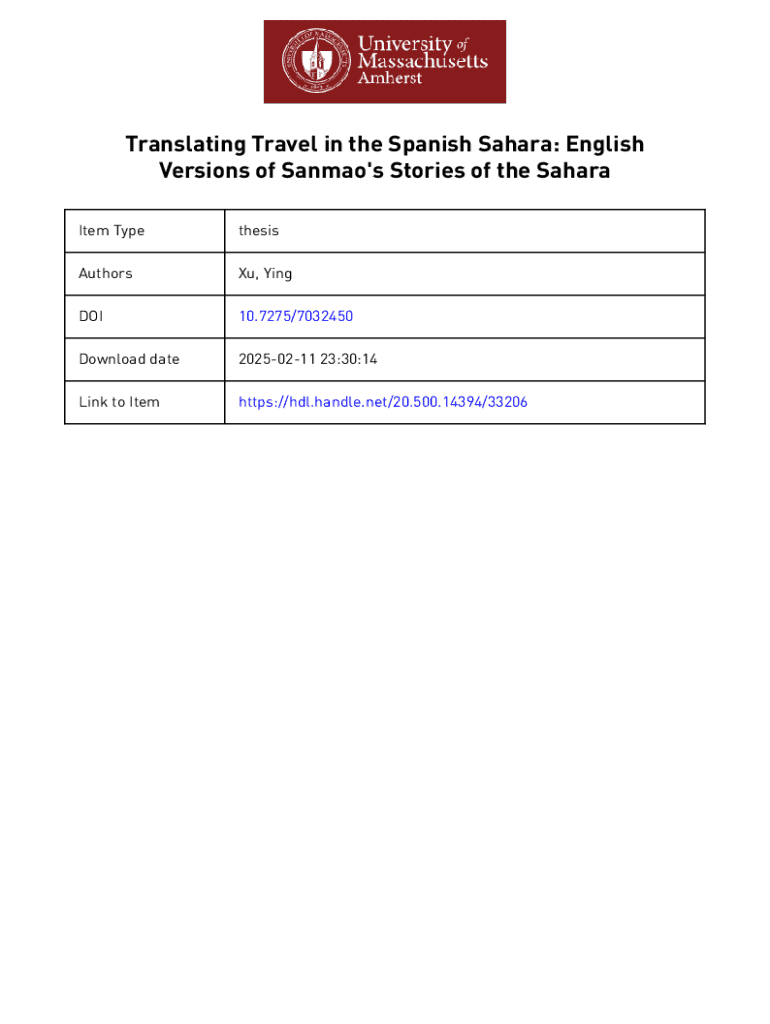 Translating Travel in the Spanish Sahara: English Versions of Sanmao\'s Stories of the Sahara Item TypethesisAuthorsXu, YingDOI10.7275/7032450Download date20250211 23:30:14Link to Itemhttps://hdl.handle.net/20.500.14394/33206TRANSLATING