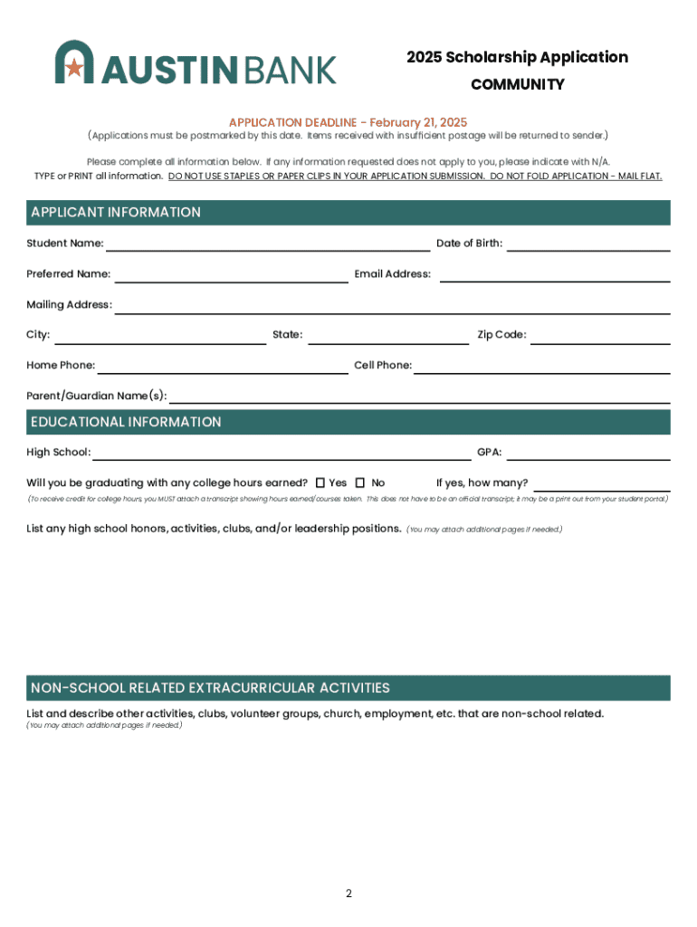 2025 Scholarship Application COMMUNITY Austin Bank has provided financial services to East Texas since 1900. In keeping with their tradition of community service and a commitment to education, Austin