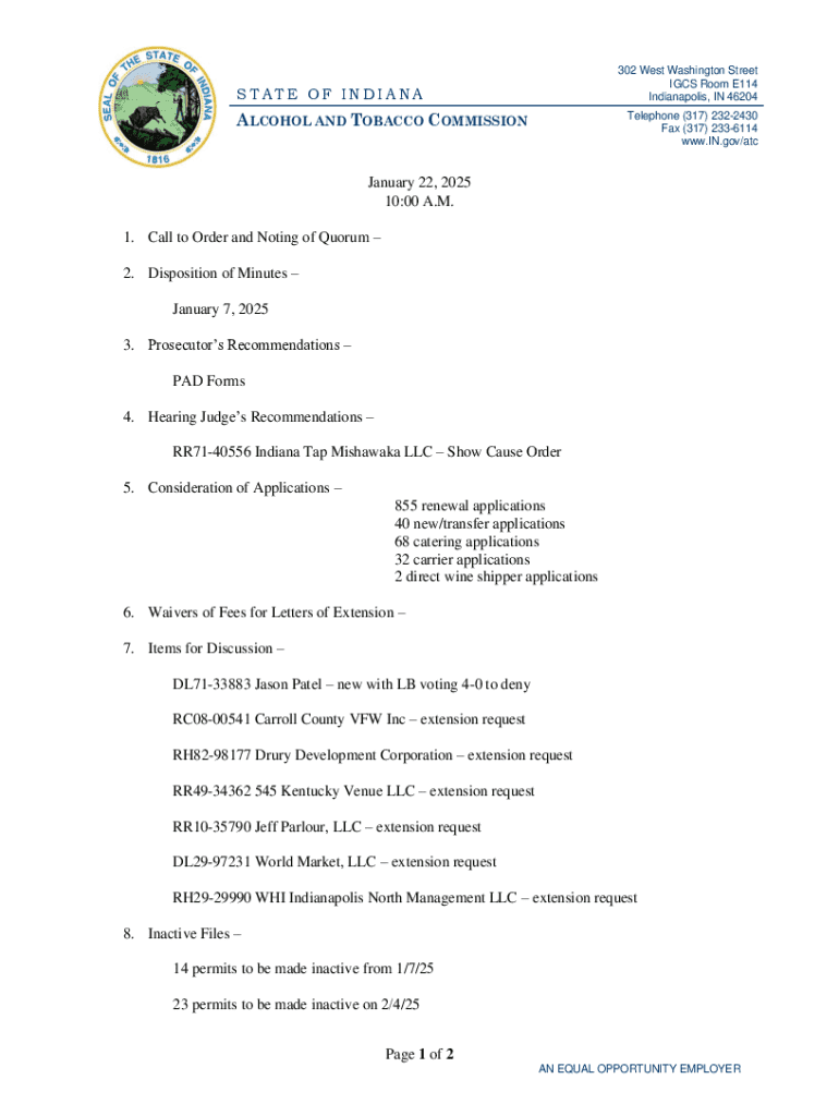 302 West Washington Street IGCS Room E114 Indianapolis, IN 46204STATE OF INDIANAALCOHOL AND TOBACCO COMMISSIONTelephone (317) 2322430 Fax (317) 2336114 www.IN.gov/atcJanuary 22, 2025 10:00 A.M. 1.