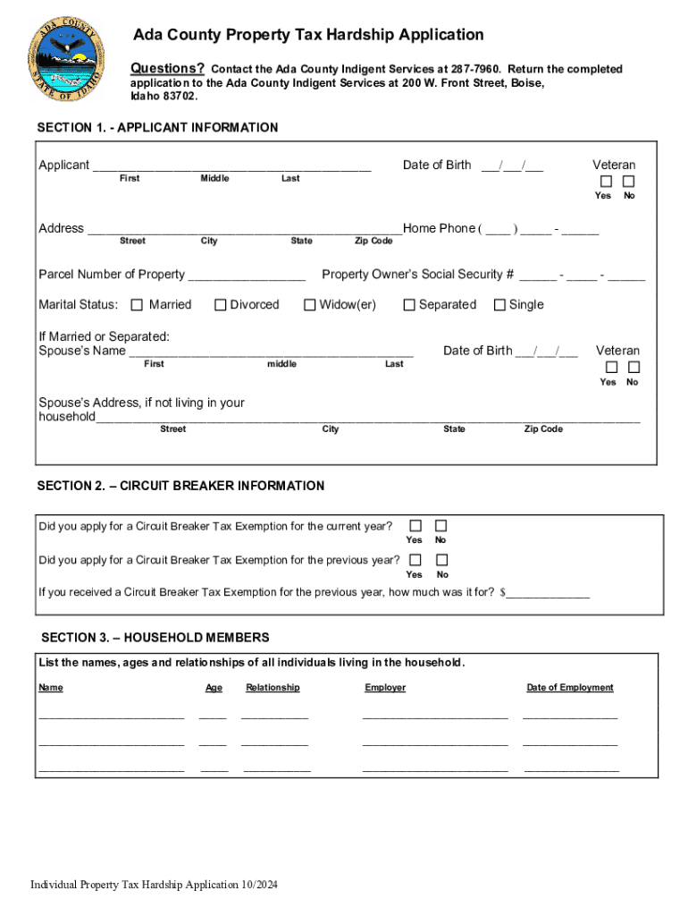 Ada County Property Tax Hardship Application Questions? Contact the Ada County Indigent Services at 2877960. Return the completed application to the Ada County Indigent Services at 200 W. Front Street,