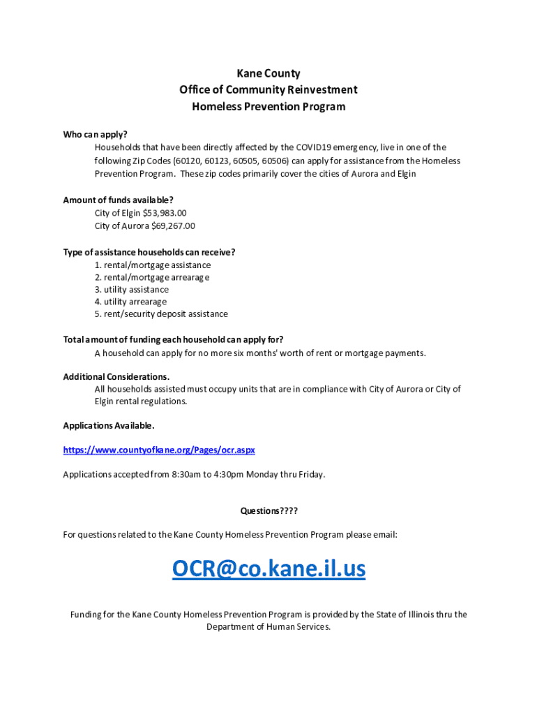 This document outlines the eligibility and application process for households affected by the COVID19 emergency seeking assistance through the Homeless Prevention Program in Kane County, primarily for residents of Aurora and Elgin. It details the types of financial assistance available, amounts of funds per city, and compliance requirements for rental units.