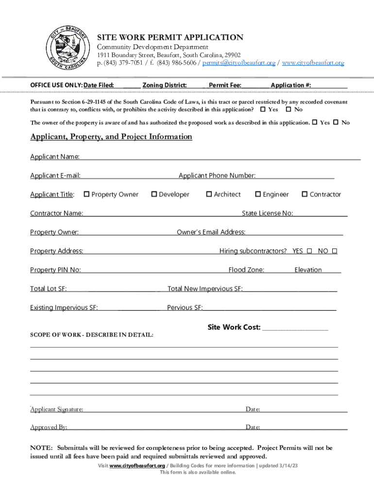 Get the free SITE WORK PERMIT APPLICATION Applicant, Property, and Project ...
