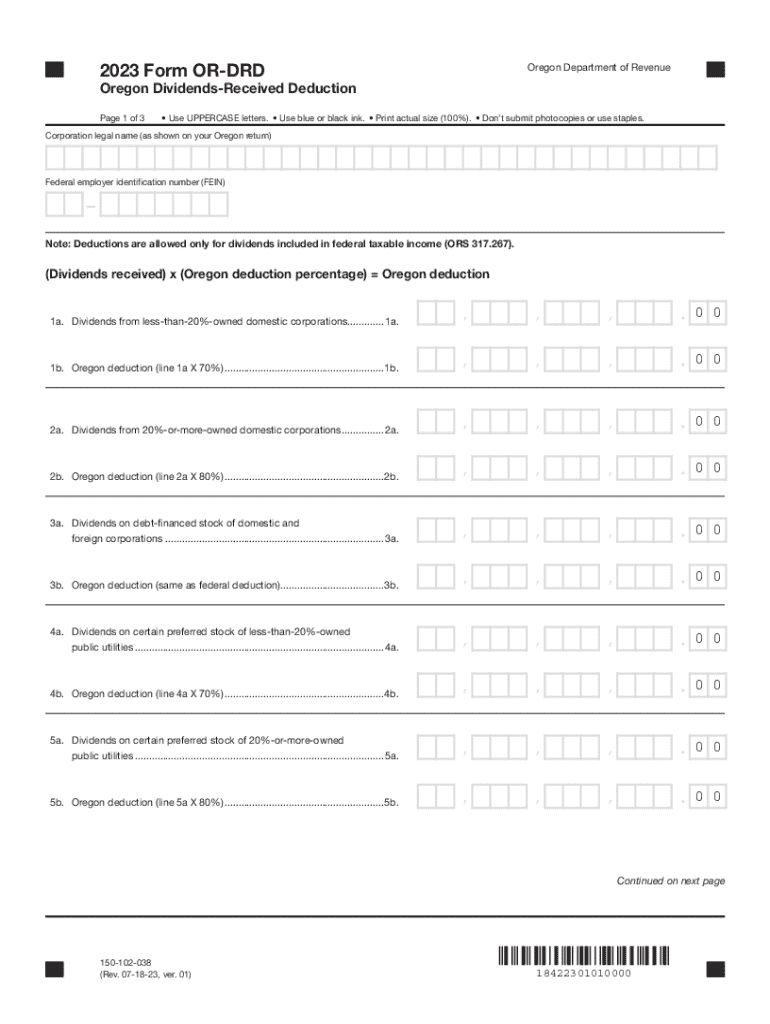 Form2023 Form ORDRDAll layersWith grid & dataOregon Department of RevenueOregon DividendsReceived Deduction Page 1 of 3 Use UPPERCASE letters. Use blue or black ink. Print actual size (100%). Dont