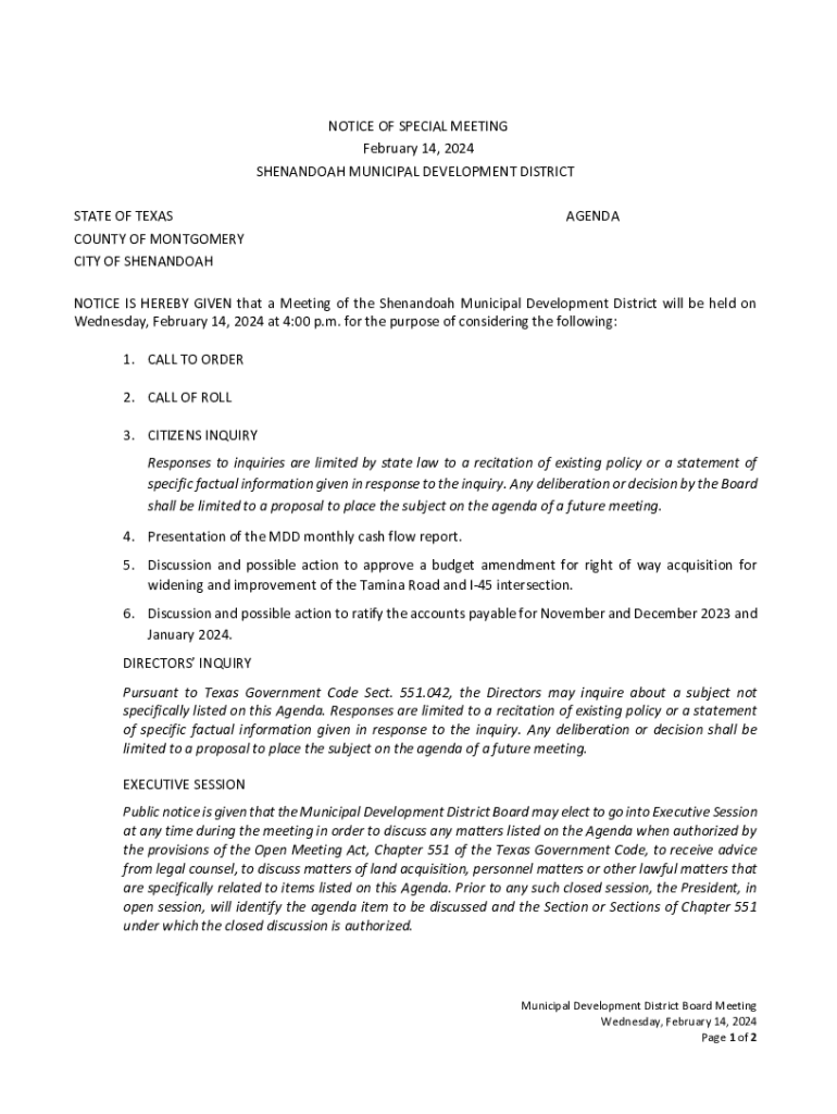 NOTICE OF SPECIAL MEETING February 14, 2024 SHENANDOAH MUNICIPAL DEVELOPMENT DISTRICT STATE OF TEXAS COUNTY OF MONTGOMERY CITY OF SHENANDOAHAGENDANOTICE IS HEREBY GIVEN that a Meeting of the Shenandoah