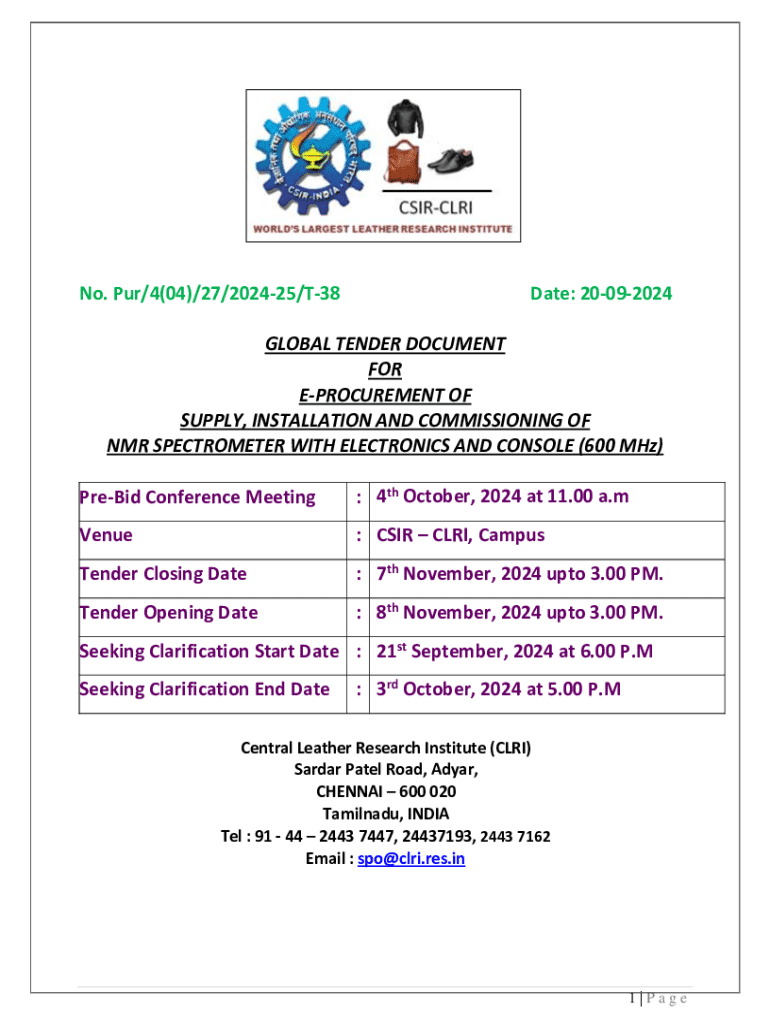 This document outlines the tender process for the supply, installation, and commissioning of an NMR Spectrometer with Electronics and Console of 600 MHz. It includes details on bidding invitations, eligibility criteria, technical specifications, and conditions of contract.