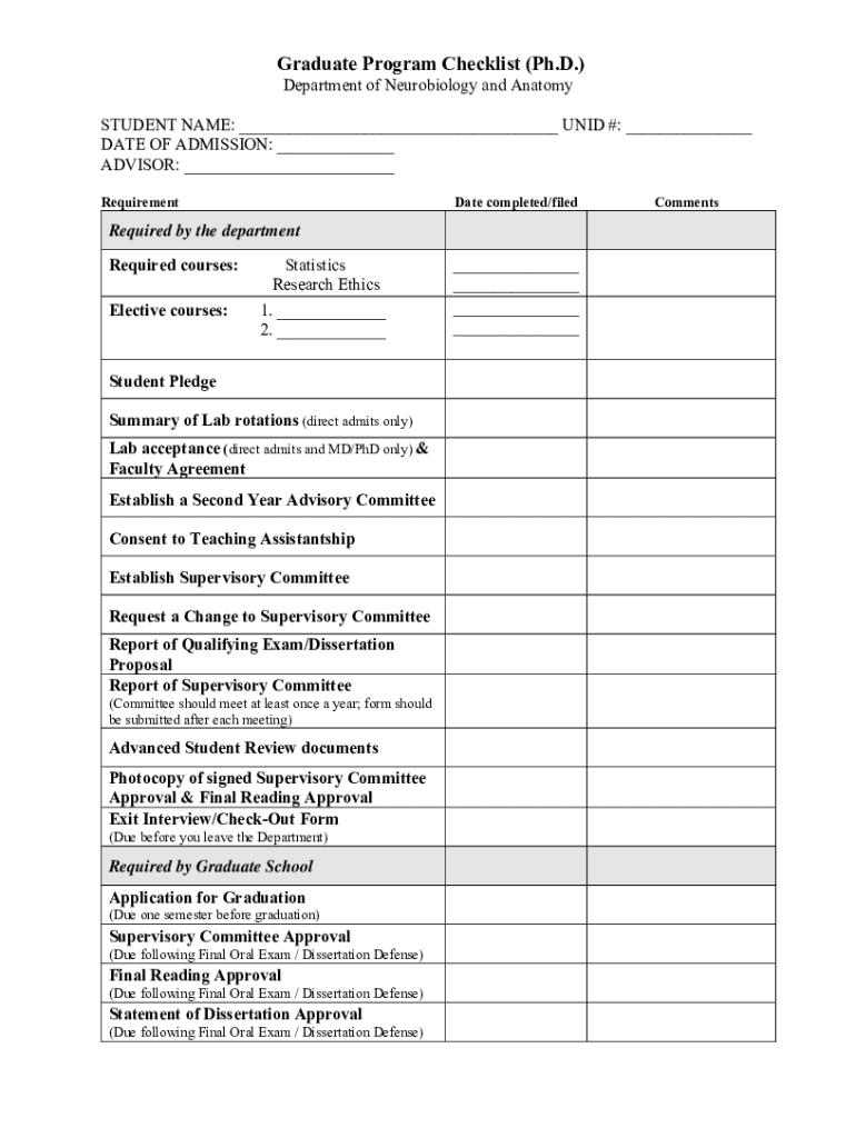 Graduate Program Checklist (Ph.D.) Department of Neurobiology and Anatomy STUDENT NAME: ___ UNID #: ___ DATE OF ADMISSION: ___ ADVISOR: ___ RequirementDate completed/filedRequired by the department