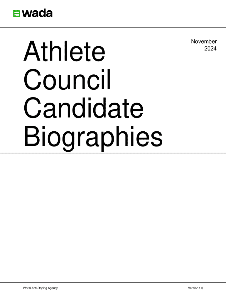Athlete Council Candidate BiographiesWorld AntiDoping AgencyNovember 2024Version 1.0Table of Contents BARAT ___ 3 BATT ___ 5 BRORSSON ___ 6 BROSE ___ 7 BUWALDA___ 9 OSI ___ 9 CROUIN ___ 10 CUNLIFFESTEEL