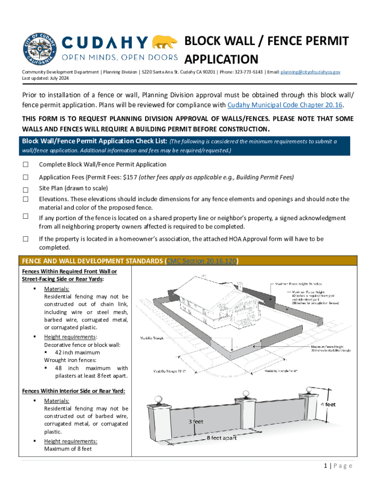 BLOCK WALL / FENCE PERMIT APPLICATIONCommunity Development Department | Planning Division | 5220 Santa Ana St. Cudahy CA 90201 | Phone: 3237735143 | Email: planning@cityofcudahyca.gov Last updated: