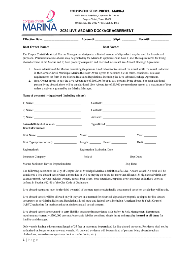CORPUS CHRISTI MUNICIPAL MARINA 400A North Shoreline, Lawrence St THead Corpus Christi, Texas 78401 Office: 361/8263980 * Fax: 361/82644592024 LIVEABOARD DOCKAGE AGREEMENT Effective Date: ___ Account#:___
