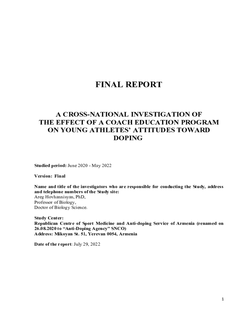 FINAL REPORT A CROSSNATIONAL INVESTIGATION OF THE EFFECT OF A COACH EDUCATION PROGRAM ON YOUNG ATHLETES ATTITUDES TOWARD DOPINGStudied period: June 2020 May 2022 Version: Final Name and title of the