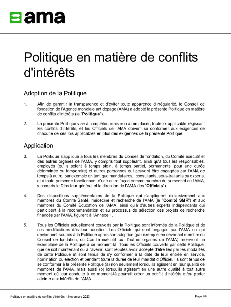 Obtenir le gratuit Politique de l'AMA en matire de conflits d'intrts