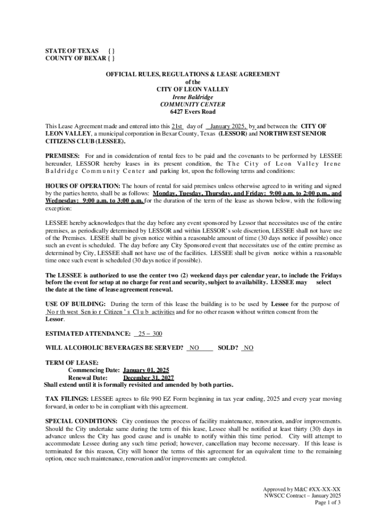 STATE OF TEXAS COUNTY OF BEXAR OFFICIAL RULES, REGULATIONS & LEASE AGREEMENT of the CITY OF LEON VALLEY Irene Baldridge COMMUNITY CENTER 6427 Evers Road This Lease Agreement made and entered into