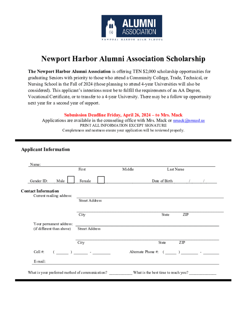 NOW AVAILABLETEN $2,000 SCHOLARSHIPS THE NEWPORT HARBOR ALUMNI ASSOCIATION is excited to announce TEN $2,000 scholarship opportunities for graduating Seniors who will attend a Community College, Trade,