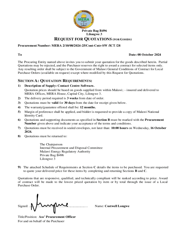 The Procuring Entity invites quotations for the supply of Contact Centre Software within Malawi, with specific requirements for delivery, warranty, and documentation submission.