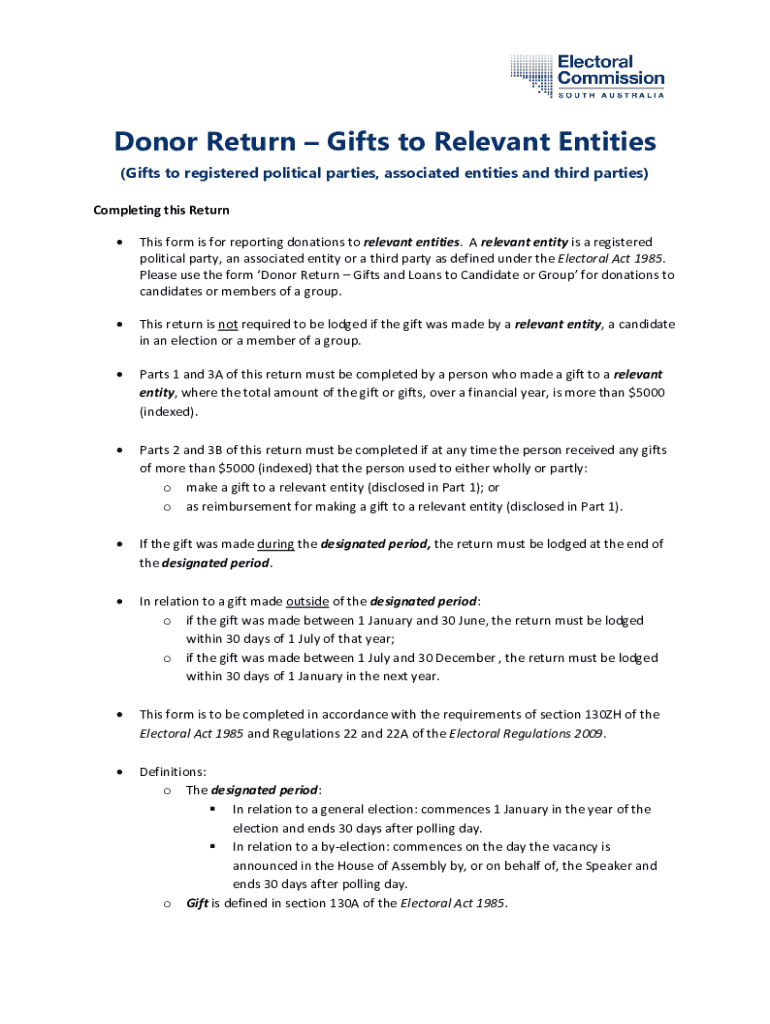 This form is for reporting donations to relevant entities, including registered political parties and associated entities as defined under the Electoral Act 1985. It outlines the necessary procedures for completing the return, including conditions under which the return must be lodged and definitions relevant to the electoral process.