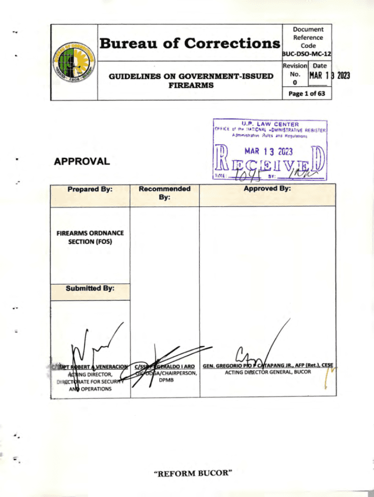 Bureau of CorrectionsDocument Reference Code 3UCDSOMC12 RevisionGUIDELINES ON GOVERNMENTISSUED FIREARMSNo.MAR 1 ) 2023Page 1 of 63U.P. LAW CENTER OFfiCt cl IKe :i::CNl BmIM5TRATIVE RESISTER AjmmiMralivt