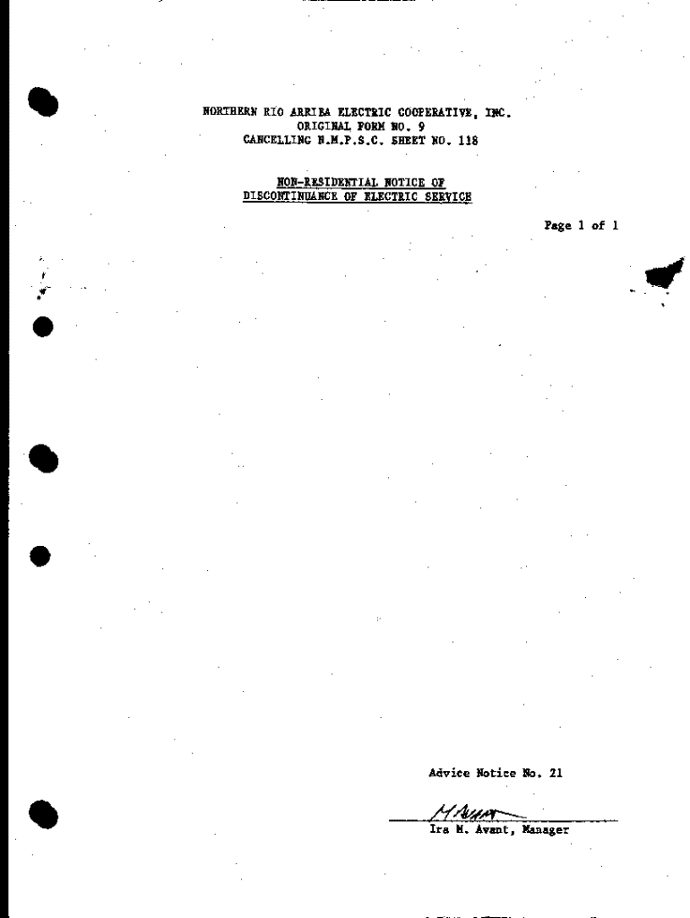 This document serves as a notice to non-residential customers regarding the discontinuance of electric service due to non-payment of utility charges. It outlines the necessary actions needed to avoid service termination and provides details about potential reconnect costs and security deposits.