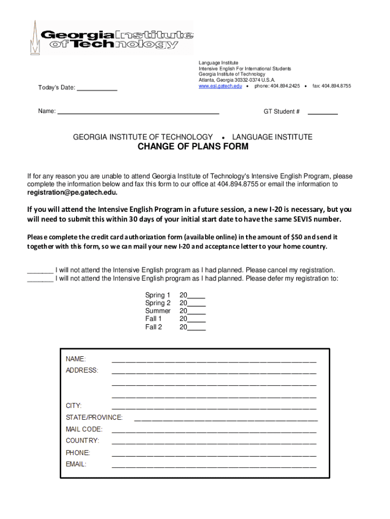 Language Institute Intensive English For International Students Georgia Institute of Technology Atlanta, Georgia 303320374 U.S.A. www.esl.gatech.edu phone: 404.894.2425 Todays Date:Name:fax: 404.894.8755GT