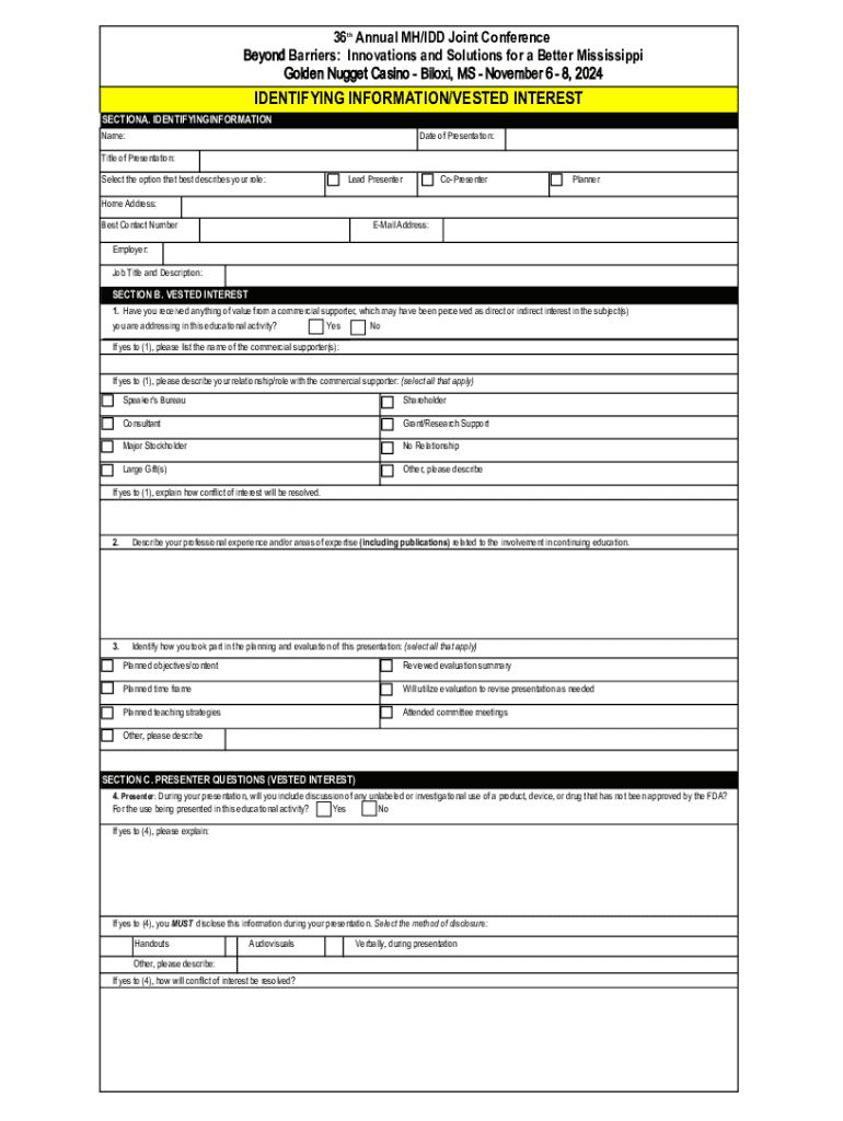 36th Annual MH/IDD Joint Conference Beyond Barriers: Innovations and Solutions for a Better Mississippi Golden Nugget Casino Biloxi, MS November 6 8, 2024IDENTIFYING INFORMATION/VESTED INTEREST SECTIONA.