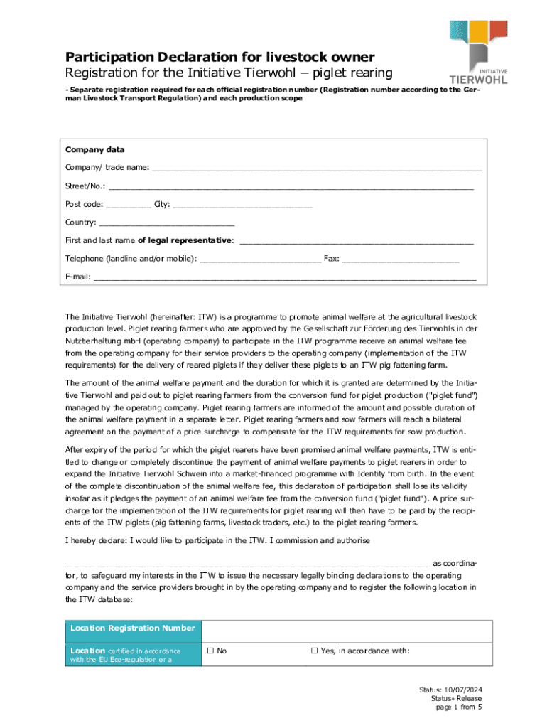 This document is a declaration for livestock owners wishing to register for the Initiative Tierwohl, which promotes animal welfare in piglet rearing. It outlines the obligations and terms of participation, including company data, coordinator commissioning, and the potential for animal welfare payments.