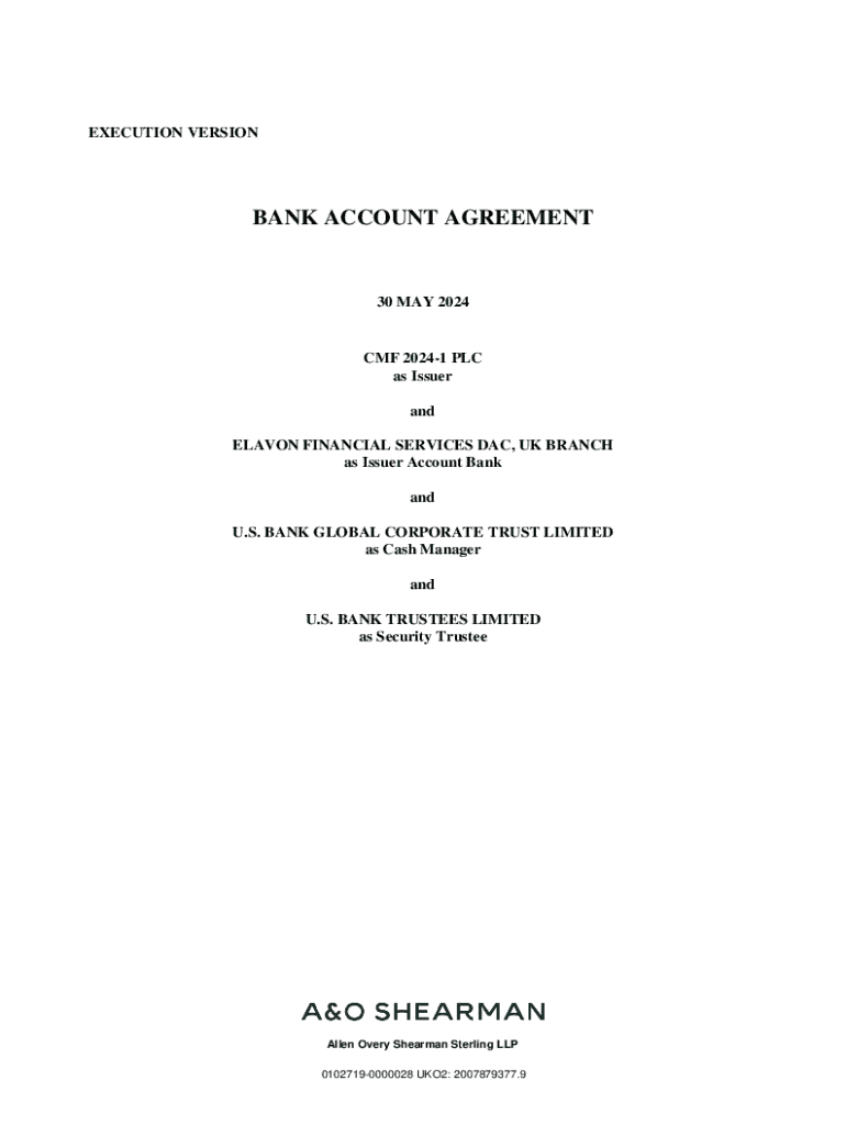 This document outlines the agreement between CMF 2024-1 PLC and various financial institutions regarding the management and operation of issuer accounts, including roles and responsibilities of the issuer account bank, payments, mandates, acknowledgements, certifications, tax status, and other relevant conditions.