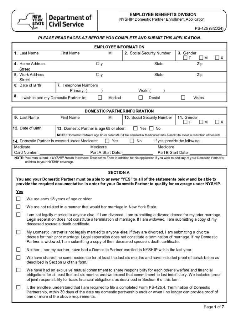 EMPLOYEE BENEFITS DIVISIONNYSHIP Domestic Partner Enrollment Application PS425 (9/2024) PLEASE READ PAGES 47 BEFORE YOU COMPLETE AND SUBMIT THIS APPLICATION. EMPLOYEE INFORMATION 1. Last Name 4. Home