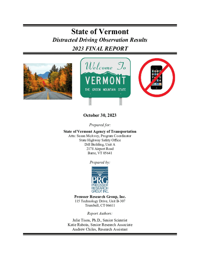 This document presents the findings of the distracted driving observation conducted in Vermont, analyzing distracted driving rates based on various factors including site types, driver demographics, and vehicle types. It also discusses the impact of enforcement strategies on driving behaviors and the overall trends observed over time.