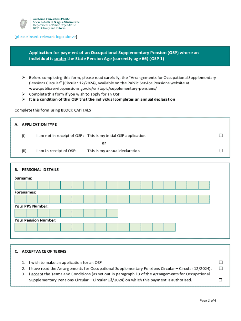 Application form for individuals under the State Pension Age to apply for an Occupational Supplementary Pension, including conditions and eligibility requirements.