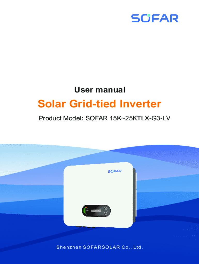 User manualSolar Gridtied Inverter Product Model: SOFAR 15K25KTLXG3LVS h e n z h e n S O FA R S O L A R C o . , L t d .SOFAR 1525KTLXG3LVUser manualContentsPreface ........................................................................................................................